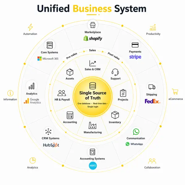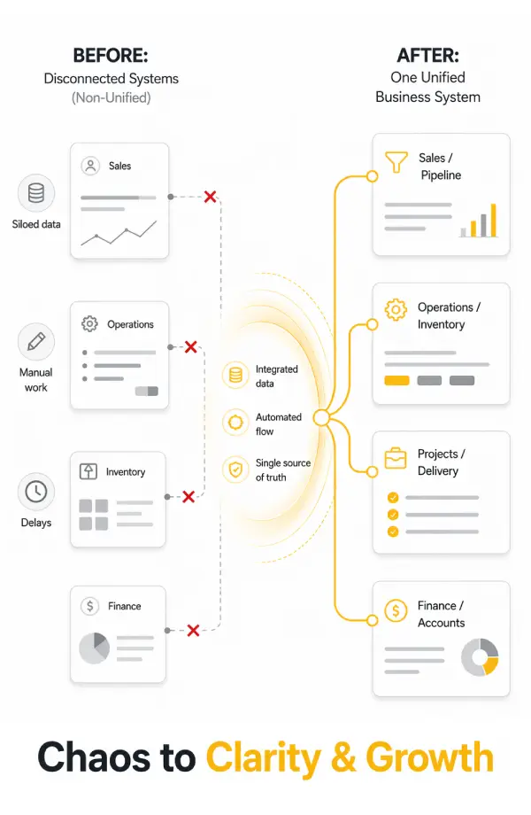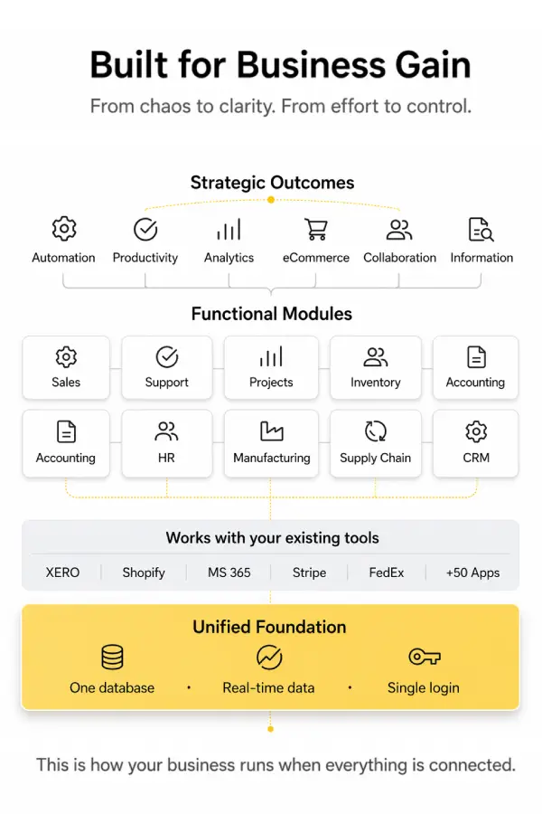 One system. Every part of your business, working together. Sales, operations, finance, and people. All working from the same data.